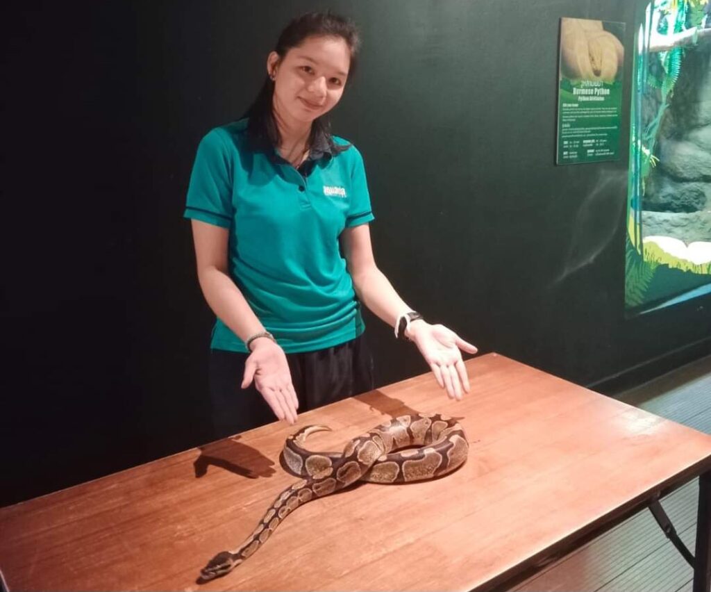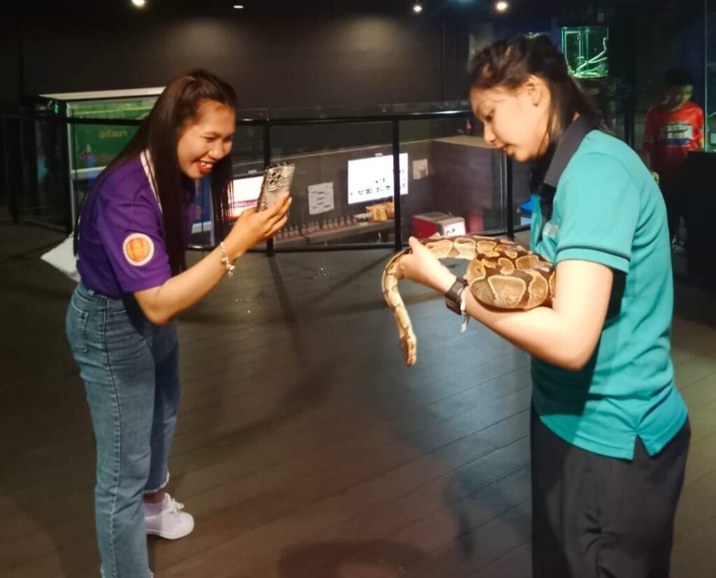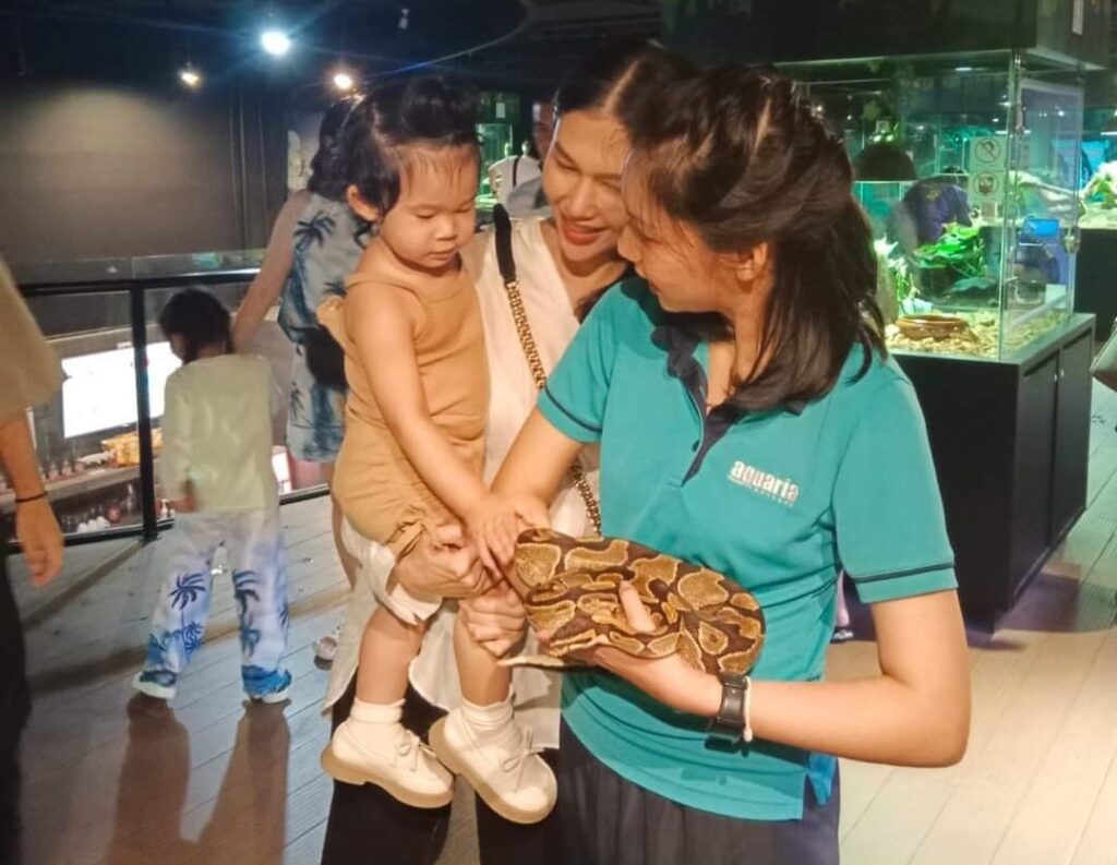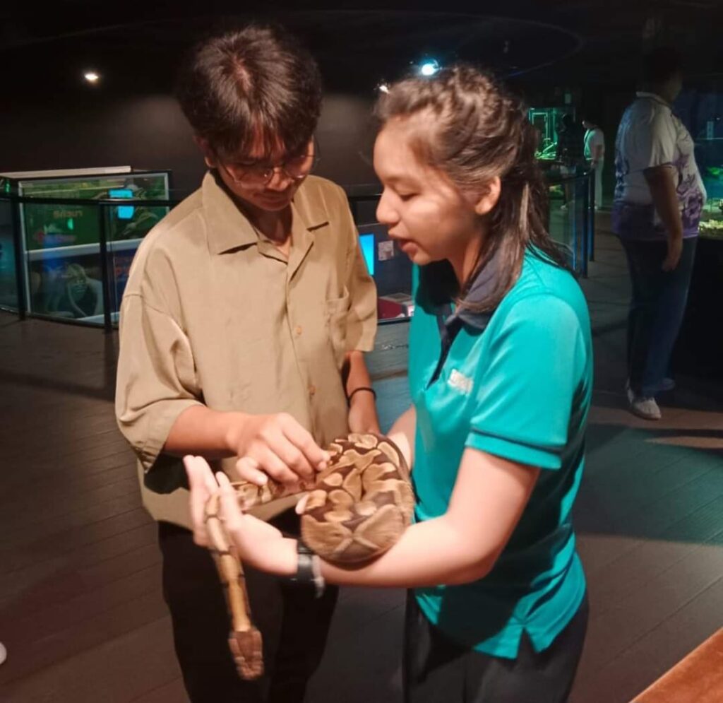 Are you courageous enough to try touching a ball python? Test your bravery with us. We have staff available to provide guidance at Aquaria Phuket, Reptile zone.