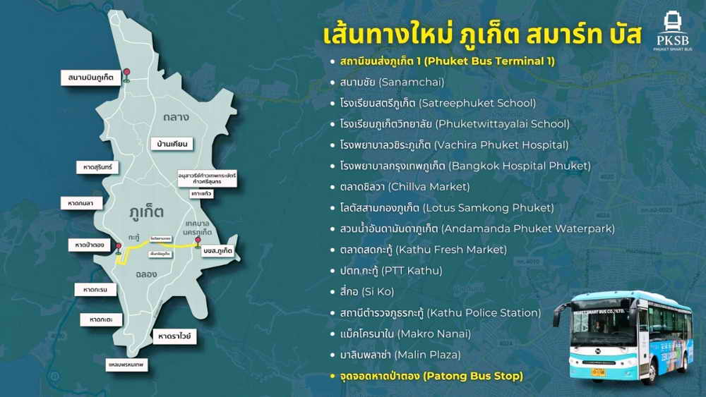 ซึ่งไฮไลท์ของเส้นทาง EV Bus ใหม่นี้ ครอบคลุมพื้นที่สำคัญ: เส้นทางใหม่นี้เชื่อมต่อจุดสำคัญต่างๆ ในภูเก็ต อาทิ สถานีขนส่งภูเก็ต 1 โรงเรียน โรงพยาบาล ตลาด และแหล่งท่องเที่ยวชื่อดัง อย่างป่าตอง เป็นต้น