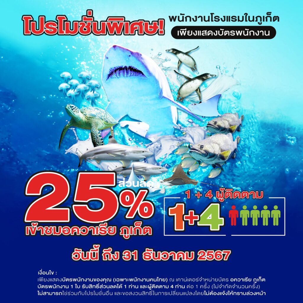 มาแล้ว!!! ตามคำเรียกร้องสำหรับ เพื่อนๆ พนักงานโรงแรม ไม่ต้องรอเทศกาลก็เที่ยวได้พร้อมรับส่วนลด 25% สำหรับพนักงานโรงแรมทั่วเกาะภูเก็ต พร้อมให้สิทธิ์ผู้ติดตามเพิ่มอีก 4 คน วันนี้ถึงสิ้นปี 67 ที่อควาเรียภูเก็ต