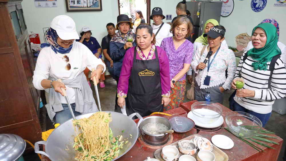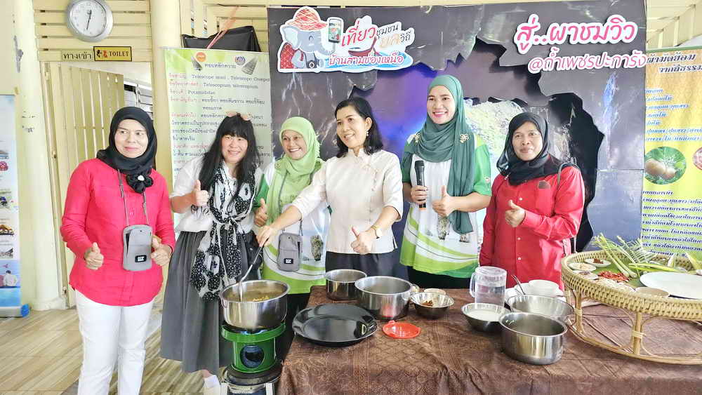ต่อด้วยการทดลองปรุงแกงหอยกันยอดเป้ง ซึ่งเป็นเมนูแกงกะทิขึ้นชื่อของชุมชนที่หาทานได้ยาก ใช้วัสดุดิบจากชุมชนเป็นหลัก และเป็นเมนูพื้นบ้านที่คนสมัยโบราณ นิยมรับประทาน เพื่อเสริมสร้างสุขภาพแม่หลังคลอดบุตร รักษาภายในให้กระชับ ฟื้นตัวได้เร็วขึ้น ส่วนผู้ชายก็ทานดี ช่วยให้ร่างกายแข็งแรง และทดลองทำขนมโมจิสามช่อง ซึ่งเป็นขนมโมจิประยุกต์ ไส้มะพร้าวอ่อนกับไส้ถั่วเหลือง จากนั้นเดินทางเข้าพัก ที่บ่อแสนวิลล่า รีสอร์ท แอนด์ สปา ที่อยู่โอบล้อมไปด้วยธรรมชาติและขุนเขา