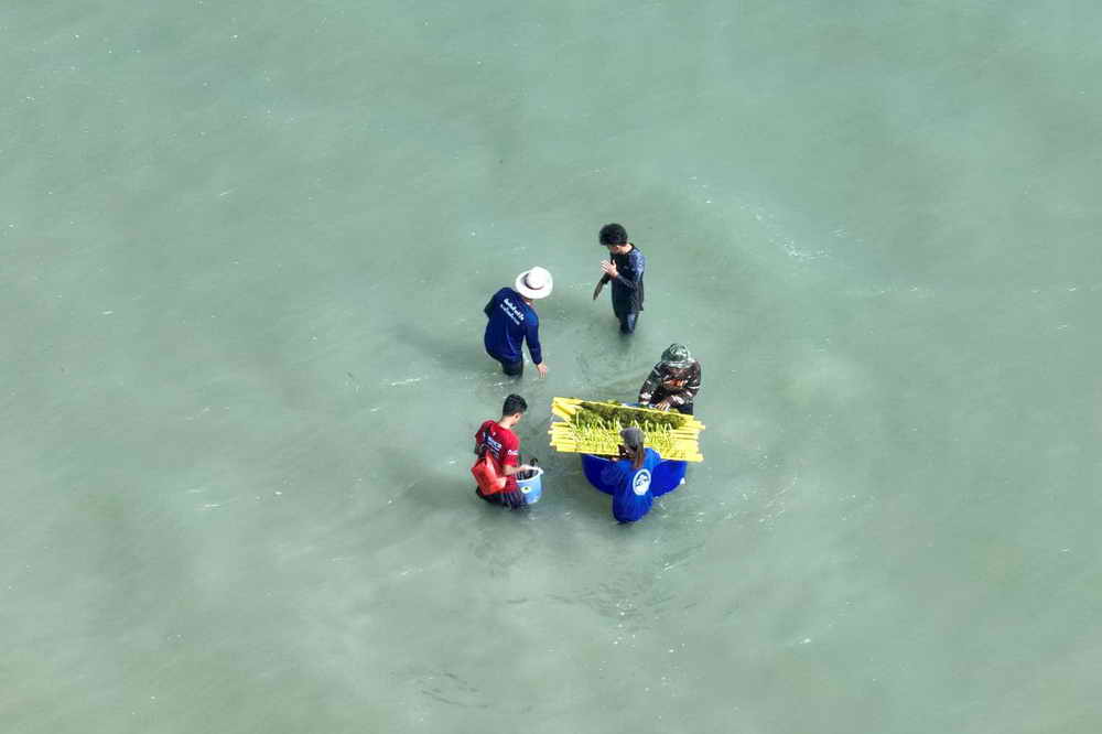 วันที่ 23 พฤศจิกายน 2567 ที่บริเวณท่าเทียบเรือราไวย์ อ.เมือง ภูเก็ต ศูนย์วิจัยทรัพยากรทางทะเลและชายฝั่งทะเลอันดามันตอนบน (ศวอบ.) พร้อมอาสาสมัครเครือข่ายจากต่างประเทศ ทำการวางแปลงเสริมอาหารให้กับพะยูนในสถานการณ์หญ้าทะเลเสื่อมโทรม โดยดำเนินการในช่วงน้ำลงต่ำสุดในรอบวัน เวลา 09.00 – 11.00 น. และทำการบินสำรวจและประเมินสุขภาพประชากรพะยูนในบริเวณโดยรอบด้วยอากาศยานไร้คนขับ เพื่อสังเกตพฤติกรรมพร้อมตรวจสุขภาพพะยูนตลอดทั้งวัน พื้นที่ราไวย์ เป็นวันที่ 19 พบร่องรอยการกินของพะยูน