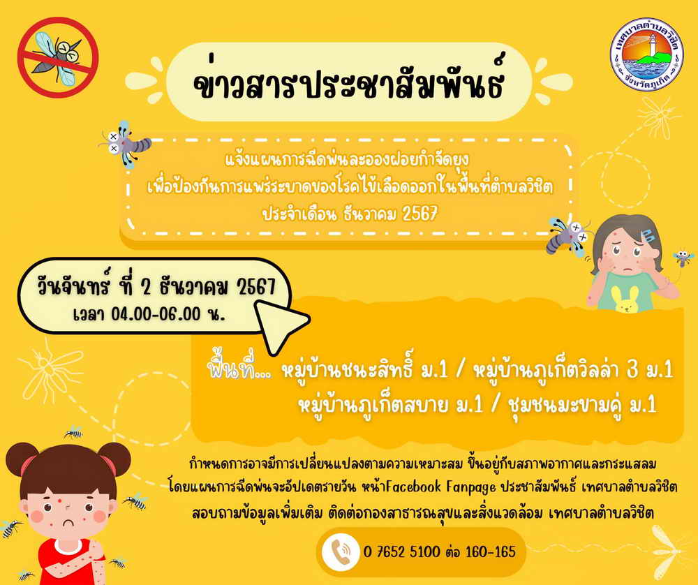 ด้วยกองสาธาณสุขเทศบาลตำบลวิชิต มีแผนการลงพื้นที่พ่นละอองฝอยกำจัดยุง ป้องกันการระบาดของโรคไข้เลือดออก ในพื้นที่ตำบลวิชิต โดยในวันจันทร์ ที่ 2 ธันวาคม 2567 ในเวลา 04.00 – 06.00 น. บริเวณหมู่บ้านชนะสิทธิ์ หมู่บ้านภูเก็ตวิลล่า 3 หมู่บ้านภูเก็ตสบาย ชุมชนมะขามคู่