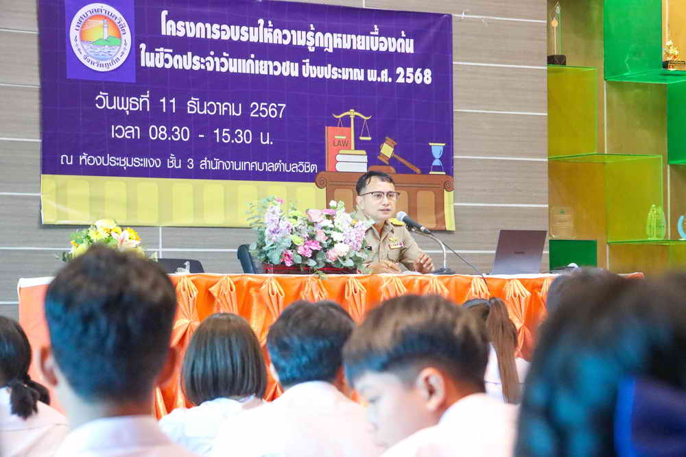 เมื่อวันที่ 11 ธันวาคม 2567 ที่ห้องประชุมระเงง ชั้น 3 สำนักงานเทศบาลตำบลวิชิต อ.เมือง ภูเก็ต นายธนวัฒน์ เทวเดช ปลัดเทศบาลตำบลวิชิต เป็นประธานในพิธีเปิดโครงการอบรมให้ความรู้กฎหมายเบื้องต้นในชีวิตประจำวันแก่เยาวชน ประจำปีงบประมาณ พ.ศ.2568 จัดโดยงานนิติการ สำนักปลัดเทศบาล เทศบาลตำบลวิชิต โดยมีหัวหน้าส่วนราชการ คณะครู และนักเรียนโรงเรียนในเขตพื้นที่ตำบลวิชิตเข้าร่วม