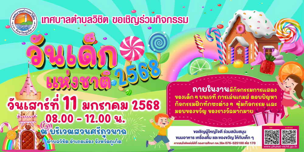 ด้วยทางเทศบาลตำบลวิชิต จัดวันเด็กแห่งชาติ ประจำปี 2568 ในวันเสาร์ที่ 11 มกราคม 2568 ณ เวทีกลางสวนศรีภูวนาถ หมู่ที่ 1 ตำบลวิชิต อำเภอเมืองภูเก็ต จังหวัดภูเก็ต ทางเทศบาลตำบลวิชิตจึงขอเชิญชวนผู้ปกครองพาน้องๆ หนูๆ มาร่วมกิจกรรม