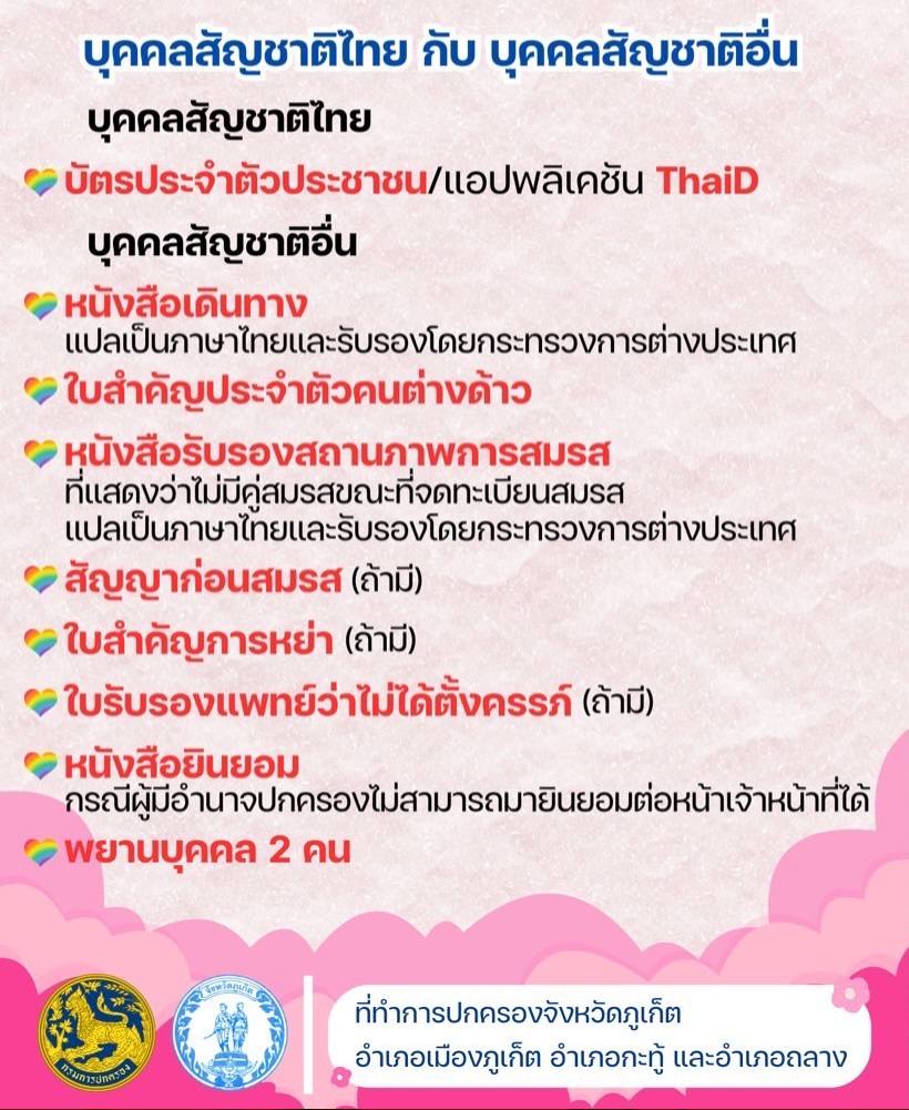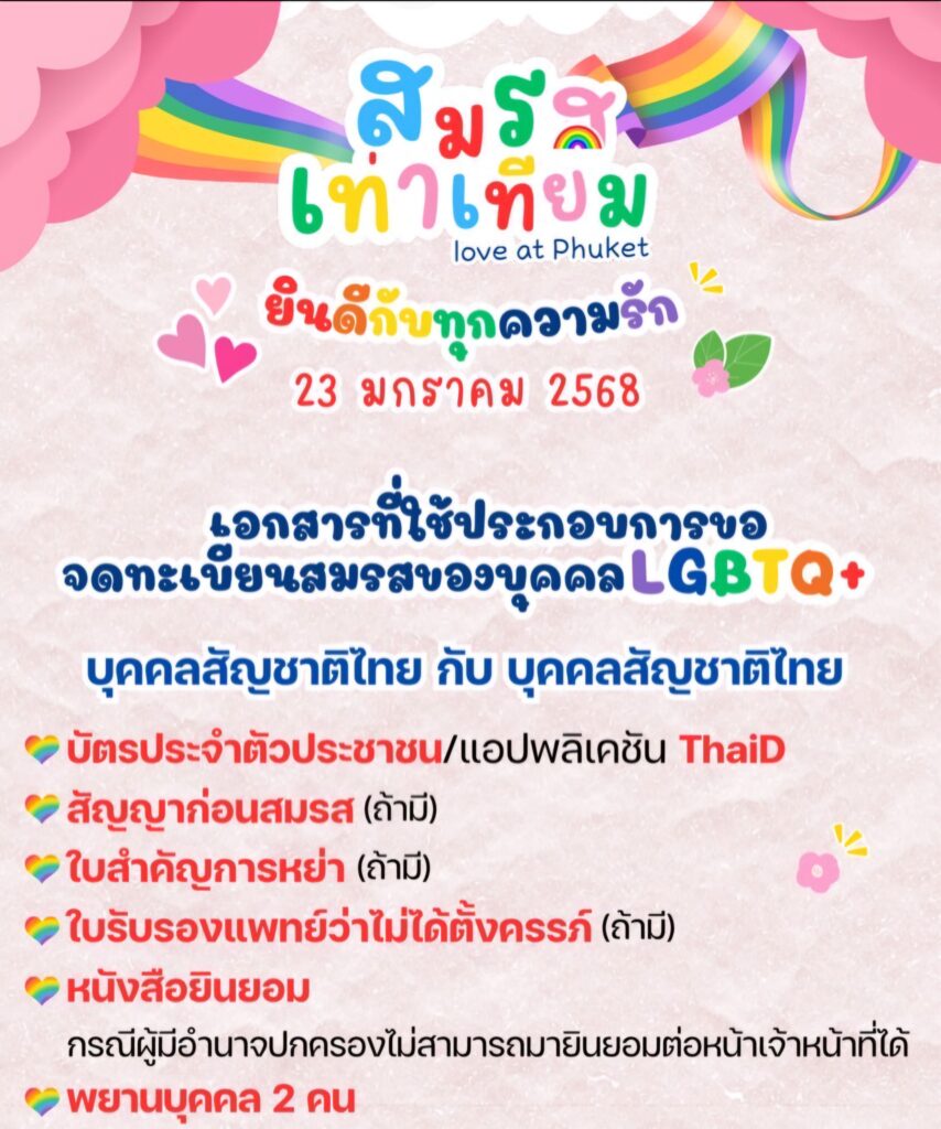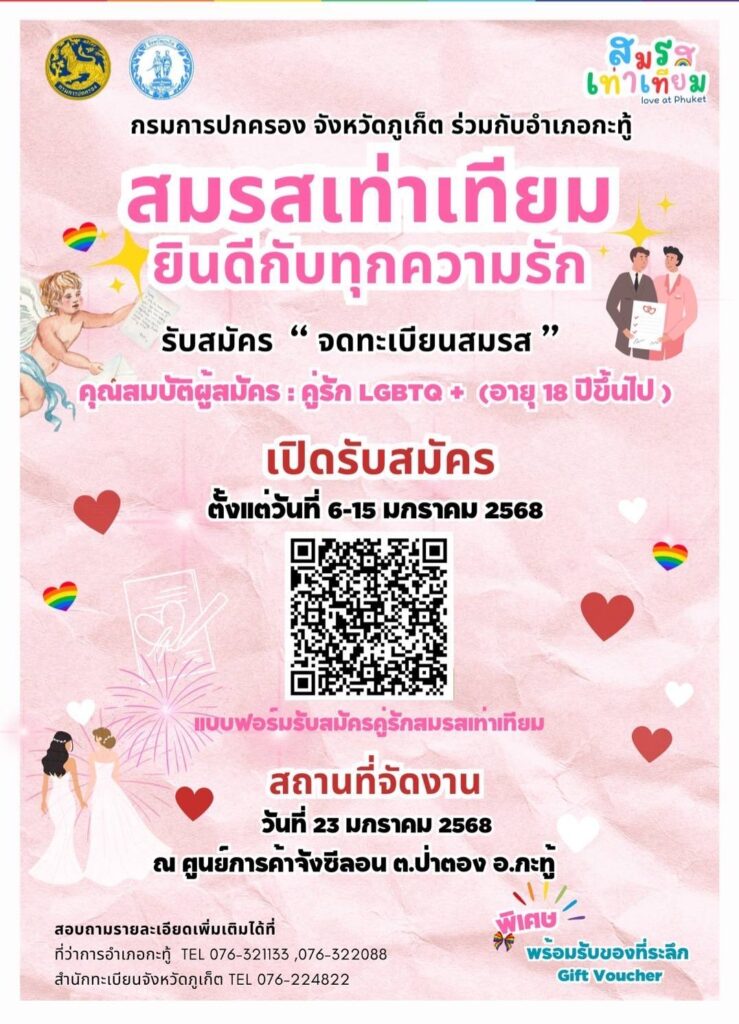 กรมการปกครอง จังหวัดภูเก็ต ร่วมกับอำเภอกะทู้ เปิดรับสมัคร จดทะเบียนสมรส คุณสมบัติ : คู่รัก LGBTQ+ (อายุ 18 ปีขึ้นไป)