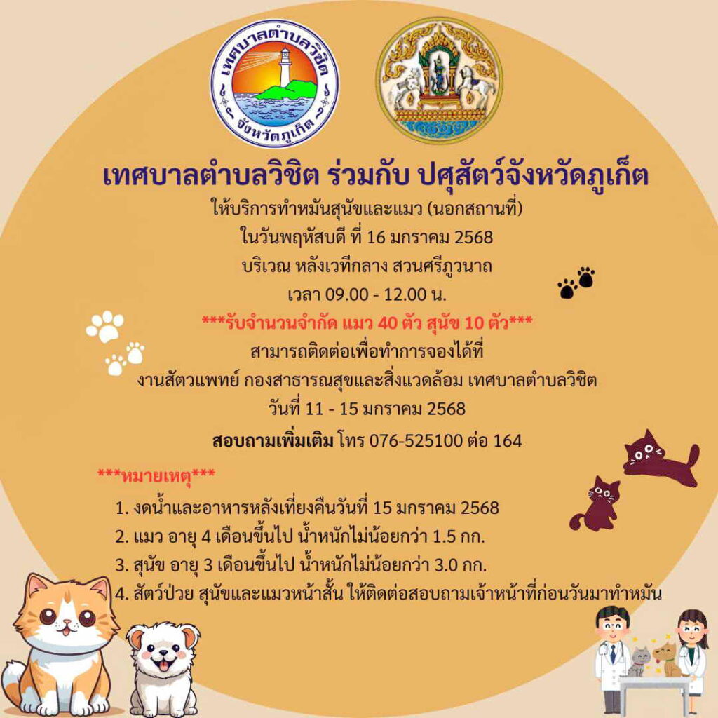 เทศบาลตำบลวิชิต ร่วมกับปศุสัตว์จังหวัดภูเก็ต เปิดให้บริการทำหมันสุนัขและแมว (นอกสถานที่) ในวันพฤหัสบดี ที่ 16 มกราคม 2568 เวลา 09.00 – 12.00 น. บริเวณหลังเวทีกลางสวนศรีภูวนาถ รับจำนวนจำกัด แมว 40 ตัว สุนัข 10 ตัว เฉพาะสุนัขและแมวในเขตตำบลวิชิตเท่านั้น