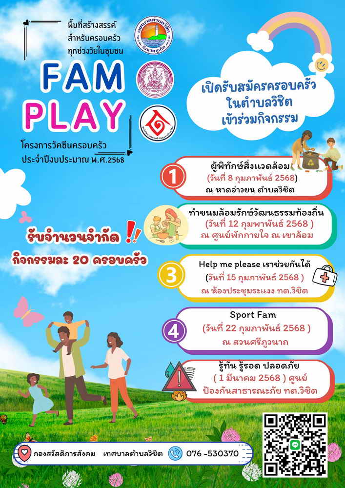 ด้วยเทศบาลตำบลวิชิต อำเภอเมือง จังหวัดภูเก็ต ได้ร่วมกับพัฒนาสังคมและความมั่นคงของมนุษย์ จังหวัดภูเก็ต และศูนย์พัฒนาครอบครัวในชุมชนตำบลวิชิต เปิดรับสมัครครอบครัวในตำบลวิชิต เข้าร่วมกิจกรรมเปิดพื้นที่สร้างสรรค์สำหรับครอบครัวทุกช่วงวัยในชุมชน FAM PLAY ในโครงการวัคซีนครอบครัว ประจำปีงบประมาณ พ.ศ.2568