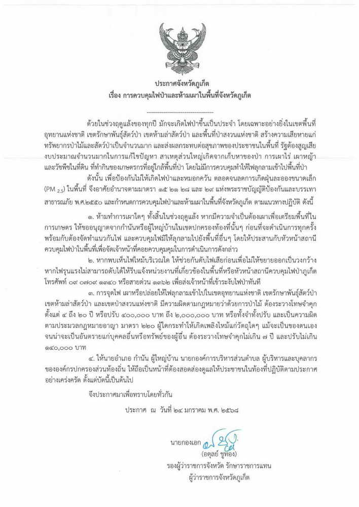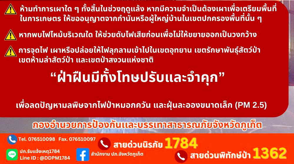 ทางจังหวัดภูเก็ต จึงได้ออกประกาศ ห้ามทำการเผาใดๆ ทั้งสิ้น ในช่วงฤดูแล้ง หากมีความจำเป็นต้องเผาเพื่อเตรียมพื้นที่ในการเกษตร ให้ขออนุญาตจากกำนัน หรือผู้ใหญ่บ้านในเขตปกครองพื้นที่นั้นๆ