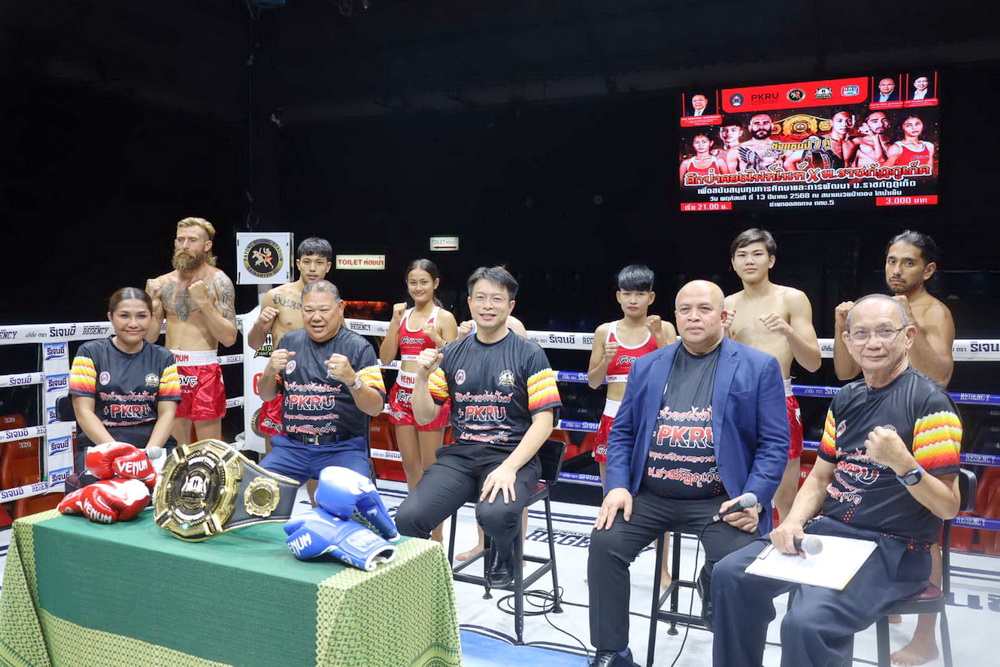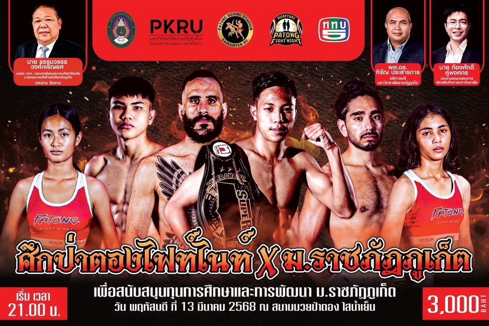 วันที่ 13 กุมภาพันธ์ 2568 ที่สนามมวยป่าตองไสน้ำเย็น ต.ป่าตอง อ.กะทู้ จ.ภูเก็ต คณะกรรมการส่งเสริมกิจการมหาวิทยาลัยราชภัฏภูเก็ต (คสม.) แถลงข่าวการจัดการแข่งขันชกมวยการกุศล “ศึกป่าตองไฟท์ไนท์” เพื่อระดมทุนสนับสนุนการศึกษาและพัฒนามหาวิทยาลัยราชภัฏภูเก็ต ซึ่งกำหนดจะจัดขึ้นในวันที่ 13 มีนาคมนี้ ที่สนามมวยป่าตองไสน้ำเย็น โดยมี ผศ.ดร.หิรัญ ประสารการ อธิการบดีมหาวิทยาลัยราชภัฏภูเก็ต, นายก้องศักดิ์ คู่พงศกร ประธานคณะกรรมการส่งเสริมกิจการมหาวิทยาลัยราชภัฏภูเก็ต, นายธรรมวรรธ วงศ์เจริญยศ บอร์ด กกท. และนายกสมาคมกีฬาจังหวัดภูเก็ต ในฐานะประธานจัดงาน และ นายบุญธรรม ญาณรัตน์ นายสนามมวยป่าตองไสน้ำเย็น ร่วมแถลงข่าว นอกจากนี้ยังมีคณะกรรมการจัดฯ คณะกรรมการ คสม. และสื่อมวลชนเข้าร่วม