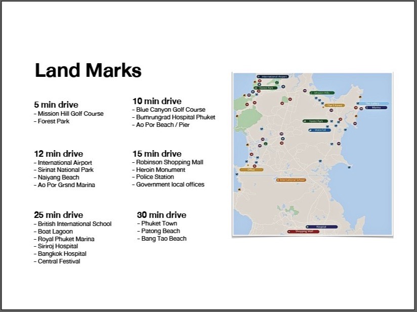 นอกจากนี้ในบริเวณใกล้เคียงยังเป็นที่ตั้งของโรงแรมและโครงการพัฒนาระดับห้าดาวจำนวนมากที่ขยายตัวตามแนวชายฝั่ง ส่งเสริมการเติบโตต่อเนื่อง และเพิ่มโอกาสในการเพิ่มมูลค่าที่ดินในอนาคต นับเป็นการลงทุนที่ตอบโจทย์ทั้งการอยู่อาศัยและสร้างผลตอบแทนที่ยั่งยืน ประกอบกับการเดินทางด้วยรถยนต์ส่วนตัวไปยังจุดต่างๆ ได้สะดวกรวดเร็ว อาทิ สนามบิน,  สนามกอล์ฟ, โรงพยาบาลบำรุงราษฎร์, มารีน่า, อุทยานแห่งชาติสิรินาถ, หาดในยาง  เป็นต้น