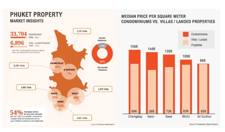 ข้อมูลล่าสุดจากรายงาน Phuket Property Market (พฤษภาคม 2568) โดย C9 Hotelworks ยืนยันแนวโน้มดังกล่าว โดยปัจจุบันภูเก็ตมียูนิตอสังหาริมทรัพย์พร้อมขายรวมทั้งสิ้น 40,600 ยูนิต จาก 343 โครงการที่เปิดขายอยู่ คอนโดมิเนียมมีราคากลางที่ 144,000 บาทต่อตารางเมตร ขณะที่บ้านเดี่ยวและวิลล่าอยู่ที่ 70,000 บาทต่อตารางเมตร โดยพื้นที่ที่มีราคาสูงที่สุดคือย่านเชิงทะเลบริเวณชายฝั่งตะวันตกของเกาะ