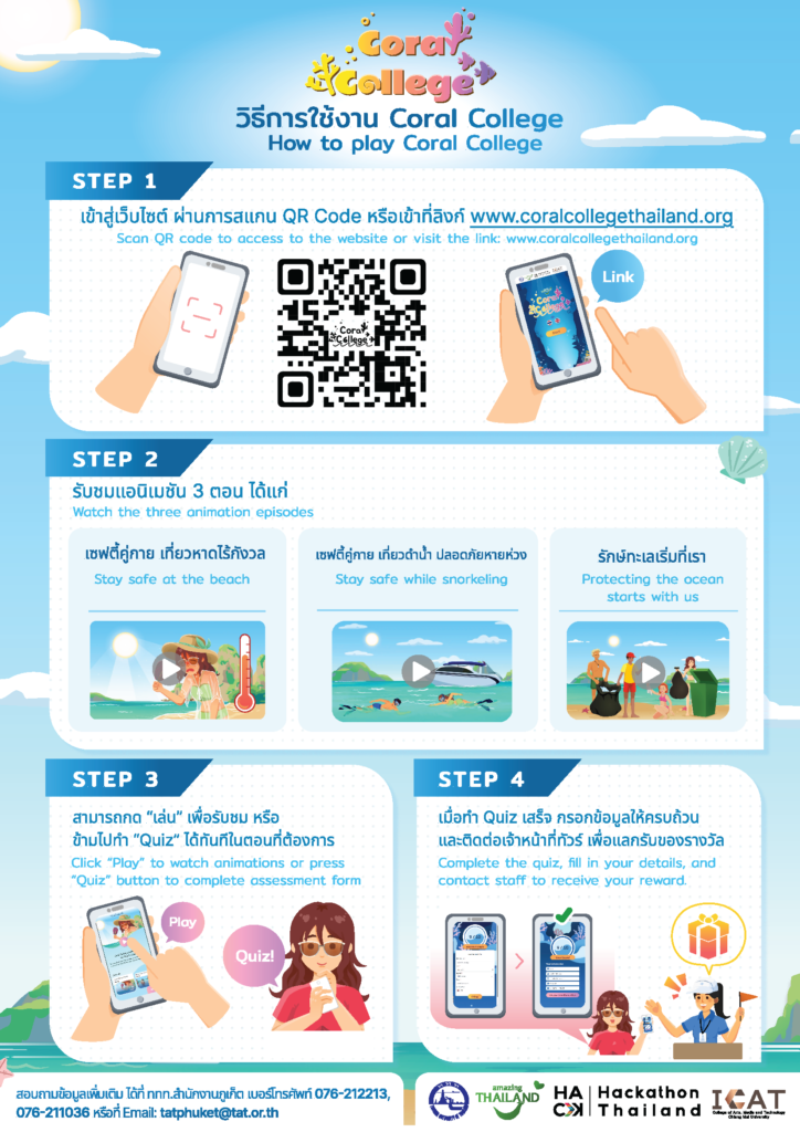สำหรับเว็บแอปพลิเคชัน “Coral College” เป็นแพลตฟอร์มที่เปิดโอกาสให้นักท่องเที่ยวสามารถเข้าไปศึกษาข้อมูลเกี่ยวกับพฤติกรรมการท่องเที่ยวทางทะเลที่เหมาะสม ความรู้พื้นฐานด้านความปลอดภัย และการอนุรักษ์ทรัพยากรทางทะเล เว็บแอปพลิเคชันสามารถใช้งานได้ 2 ภาษา ทั้งภาษาไทยและภาษาอังกฤษ มีบทเรียนเป็นคลิปวิดีโอในรูปแบบ Motion Graphic ที่เข้าใจง่าย สีสันสดใส โดยภายในงานได้เปิดโอกาสให้สื่อมวลชนและผู้เข้าร่วมงานได้ทดลองใช้ระบบเว็บแอปพลิเคชันดังกล่าว และมีสิทธิประโยชน์พิเศษให้กับนักท่องเที่ยวจากบริษัทนำเที่ยวที่เข้าร่วมโครงการฯ และเล่นเกมส์ในเว็บแอปพลิเคชัน “Coral College” โดยผู้ที่ผ่านการเรียนรู้และแบบทดสอบจะสามารถรับของที่ระลึกจาก ททท. และพันธมิตรทางการท่องเที่ยวในจังหวัดภูเก็ต อาทิ บริษัท เลิฟ อันดามัน จำกัด บริษัท นิกรมารีน จำกัด บริษัท อันดามัน เวฟ มาสเตอร์ จำกัด