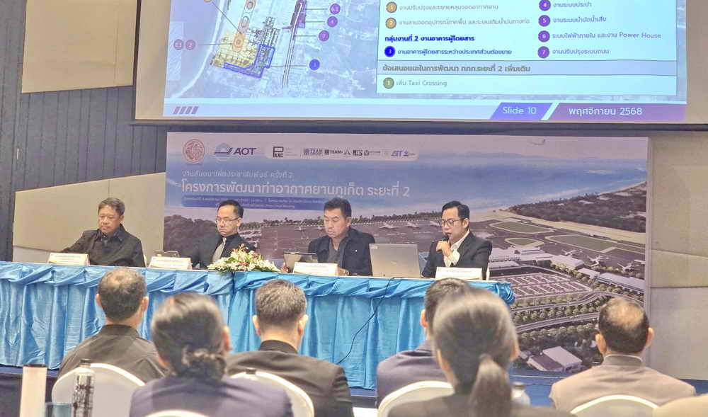 วันที่ 6 พฤศจิกายน 2568 บริษัท ท่าอากาศยานไทย จำกัด (มหาชน) (ทอท.) เดินหน้าจัดกิจกรรมสัมมนาประชาสัมพันธ์ ครั้งที่ 2 โครงการพัฒนาท่าอากาศยานภูเก็ต ระยะที่ 2 (โครงการฯ) เพื่อศึกษาและความคืบหน้าในการดำเนินโครงการฯ พร้อมทั้งรับฟังความคิดเห็นและข้อเสนอแนะจากหน่วยงานที่เกี่ยวข้อง เพื่อนำมาพิจารณาประกอบการดำเนินโครงการฯ โดยงานสัมนาดังกล่าว จัดขึ้น ณ โรงแรมสแปลช บีช รีสอร์ท ตำบลไม้ขาว อำเภอถลาง จังหวัดภูเก็ต ซึ่ง ทอท. ได้ว่าจ้างกลุ่มบริษัท พี.เค.เอ.ซี. ในการสำรวจและออกแบบโครงการให้เป็นไปตามเป้าประสงค์และแผนยุทธศาสตร์ที่กำหนดไว้ โดยมีนายสมาวิษฏ์ สุพรรณไพ รองผู้ว่าราชการจังหวัดภูเก็ต ให้เกียรติมาเป็นประธานเปิดงานสัมมนา และมีผู้เข้าร่วมจากภาคส่วนต่าง ๆ รวมกว่า 150 ท่าน ประกอบด้วย หน่วยงานราชการ รัฐวิสาหกิจ องค์กรปกครอง ส่วนท้องถิ่น องค์กรธุรกิจ ภาคเอกชนที่เกี่ยวข้อง และสื่อมวลชน