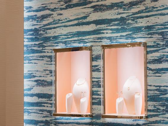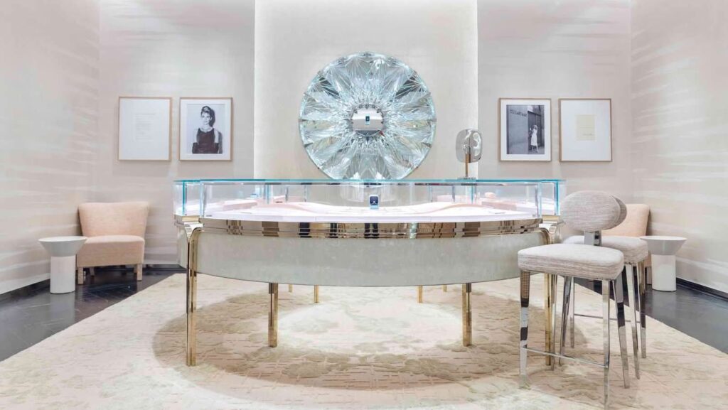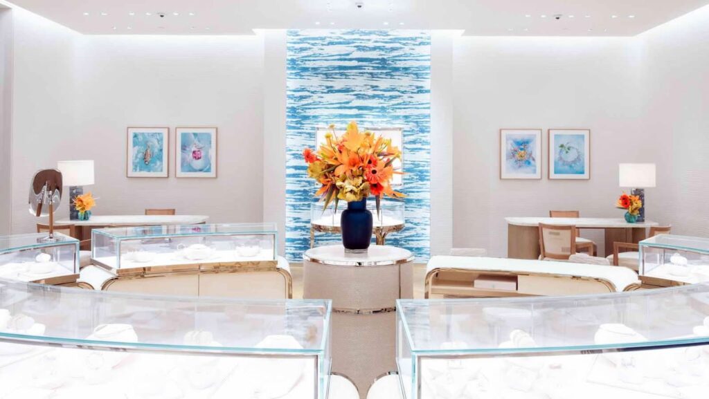 นอกจากนี้ ภายในร้านยังมีซาลอนส่วนตัว ที่ตกแต่งด้วยวอลเปเปอร์ลายกล้วยไม้ สื่อถึงความผูกพันของ Tiffany & Co. กับธรรมชาติ ใจกลางห้องประดับด้วยโต๊ะงานฝีมือแทรกคริสตัลสีขาวอย่างละเอียดอ่อนพร้อมโครงโลหะสีแชมเปญ สะท้อนการผสานระหว่างศิลปะและความหรูหราได้อย่างลงตัว เพื่อมอบประสบการณ์การเลือกซื้ออย่างเป็นส่วนตัวและใกล้ชิดแก่ลูกค้า