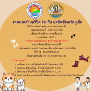 เทศบาลตำบลวิชิต ร่วมกับปศุสัตว์จังหวัดภูเก็ต เปิดให้บริการทำหมันสุนัขและแมว (นอกสถานที่) ในวันพฤหัสบดี ที่ 16 มกราคม 2568 เวลา 09.00 - 12.00 น. บริเวณ...