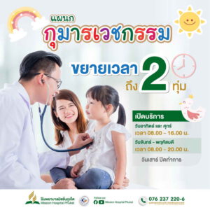 โรงพยาบาลมิชชั่นภูเก็ต แผนกกุมารเวชกรรม ขยายเวลาเปิดให้บริการ ถึง 2 ทุ่ม โดยวันอาทิตย์ และ ศุกร์ เปิดให้บริการเวลา 08.00-16.00 น. ส่วนวันจ...