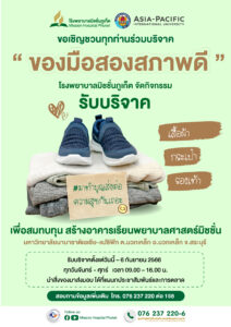 ด้วยทางโรงพยาบาลมิชชั่นภูเก็ต ได้จัดกิจกรรม รับบริจาค เสื้อผ้า กระเป๋า รองเท้า เพื่อสมทบทุนสร้างอาคารเรียนพยาบาลศาสตร์มิชชั่น มหาวิทยาลัยนานาชาติเอเชี...